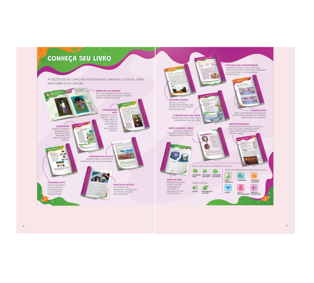 As atividades priorizam o fazer artístico, o uso de diferentes materiais e a vivência estética, ampliando o repertório cultural e favorecendo o desenvolvimento da criatividade, da imaginação e da sensibilidade. A organização clara das sequências oferece segurança ao professor e possibilita acompanhar o desenvolvimento expressivo do estudante ao longo do percurso.