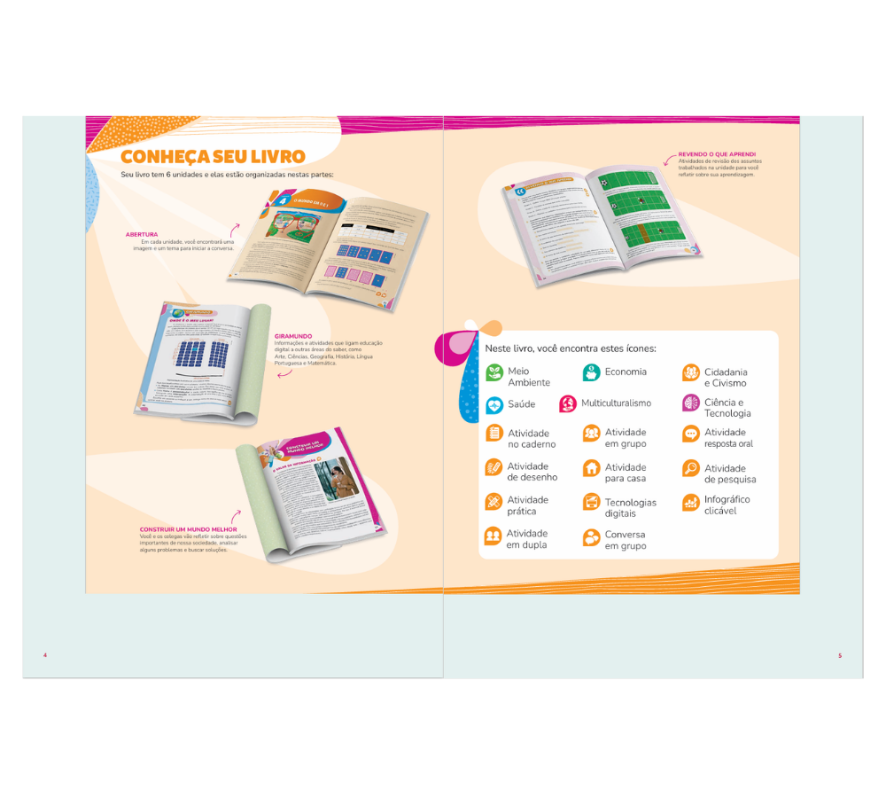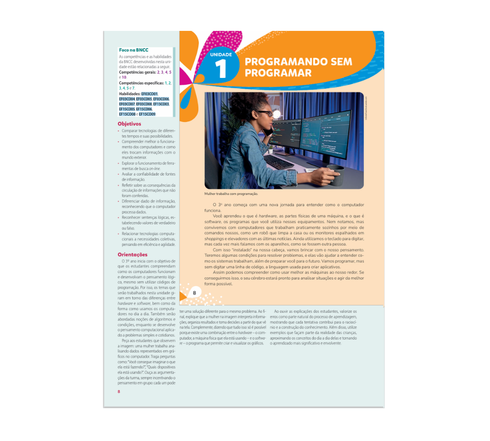 A obra Bem-me-quer Mais Educação Digital e Midiática, voltada ao 3º, 4º e 5º anos, aprofunda o pensamento computacional, a análise de informações e a resolução de problemas. As propostas ampliam o uso autônomo de recursos digitais e promovem reflexão crítica sobre tecnologia no cotidiano.