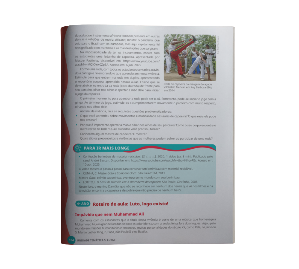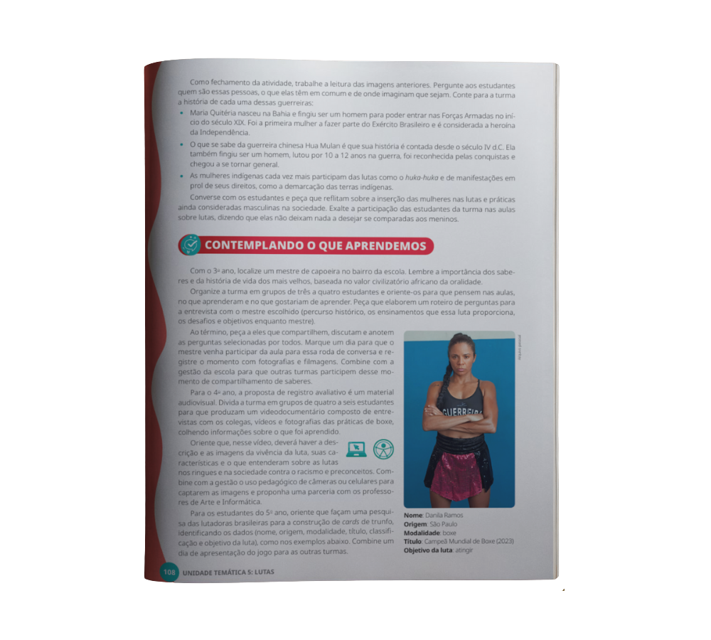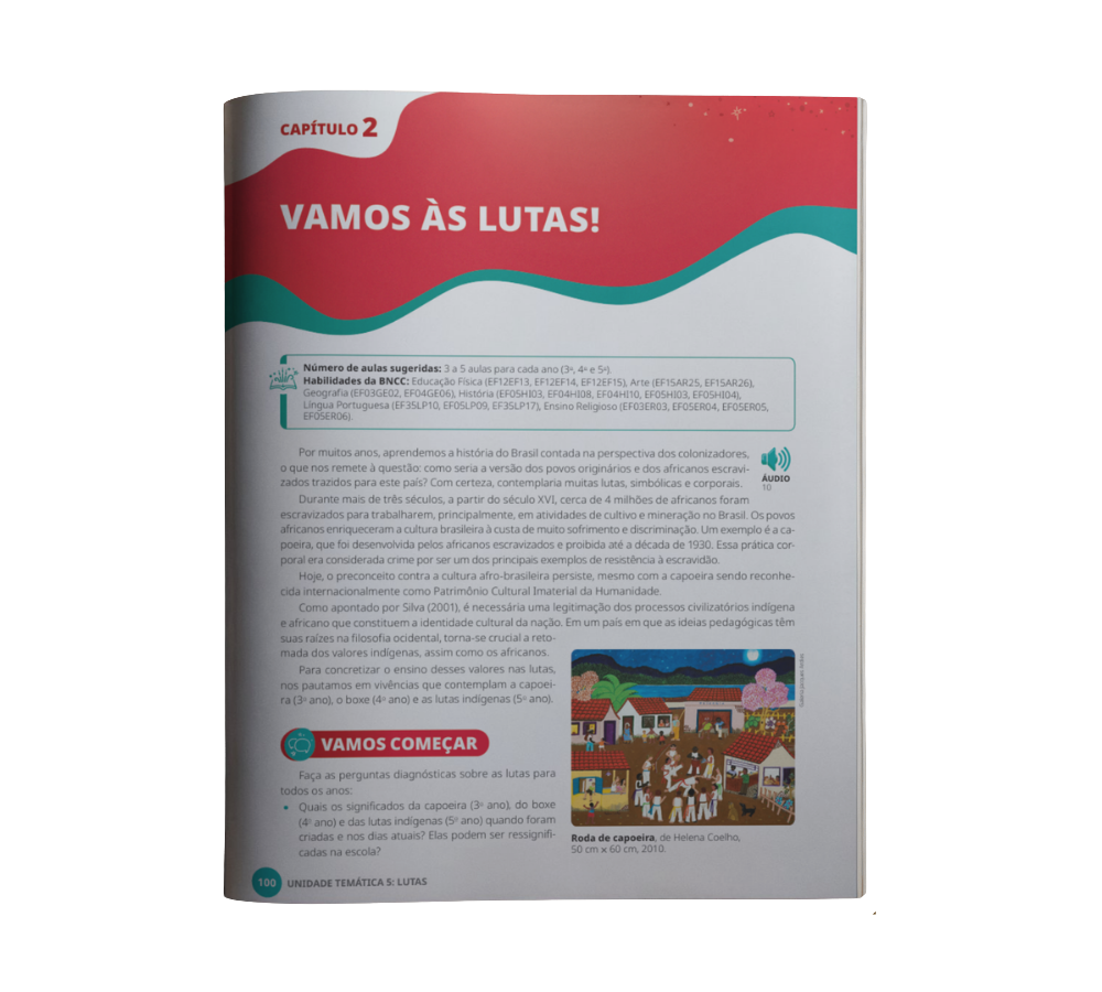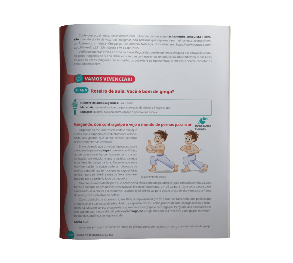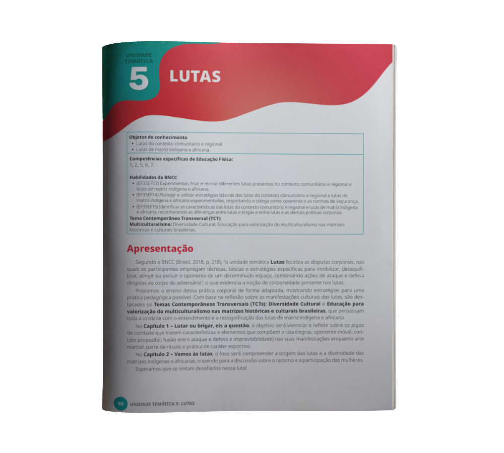 Todas as unidades da obra apresentam, logo na primeira página, um quadro de apoio que indica os objetivos de conhecimento, as competências específicas de Educação Física, as habilidades da BNCC e outras informações pedagógicas relevantes. O conteúdo é acompanhado de uma apresentação inicial que contextualiza o professor sobre a temática a ser desenvolvida.