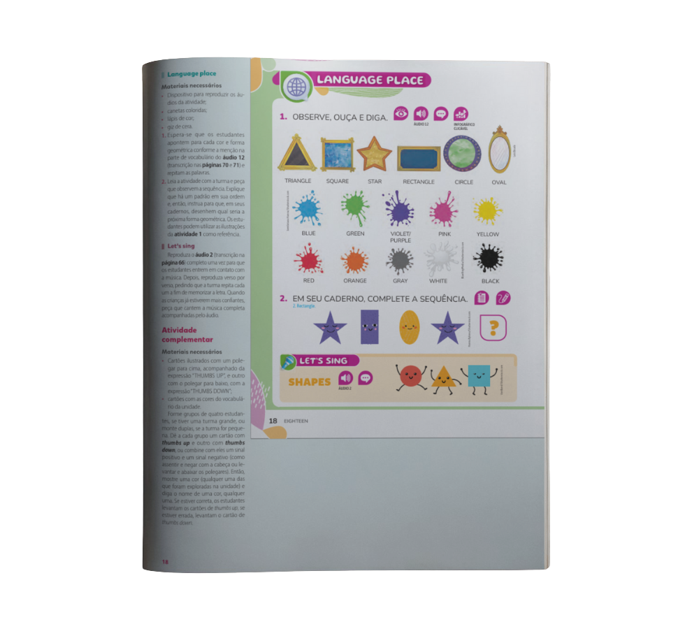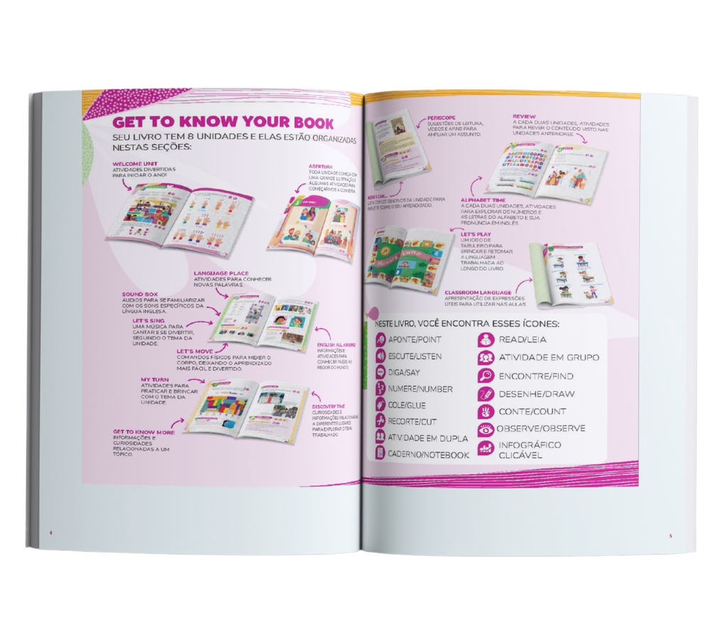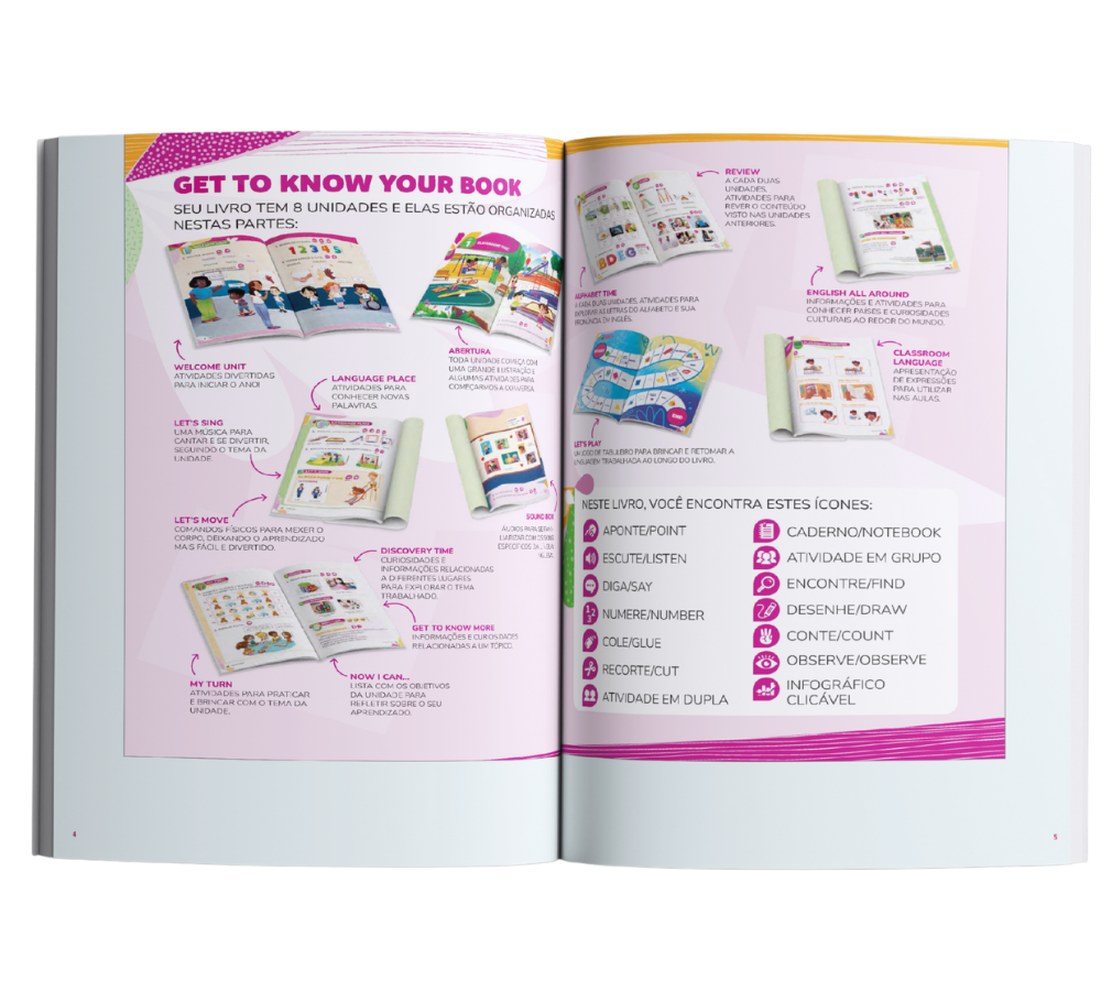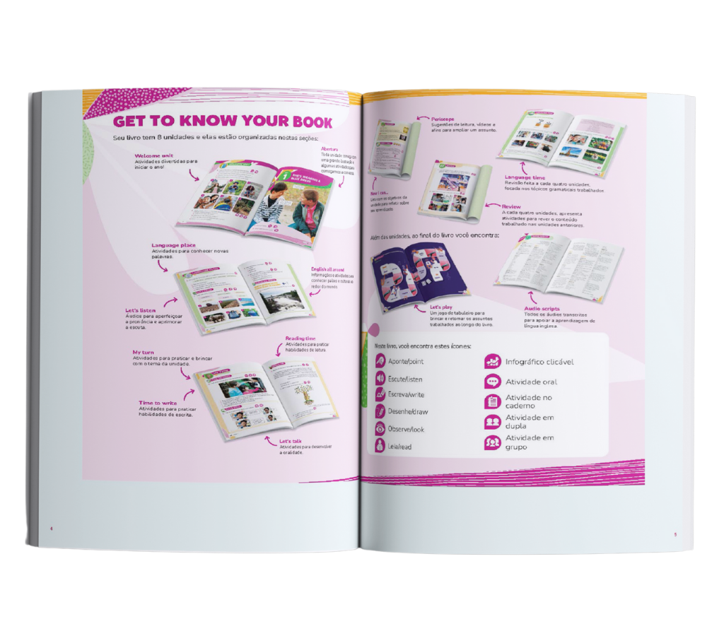 • Aprendizagem significativa para o estudante: o conteúdo é pensado para o perfil e a realidade do aluno, com atividades lúdicas, músicas, jogos e propostas de expressão que estimulam o engajamento, o uso real da língua e o desenvolvimento contínuo das quatro habilidades: ouvir, falar, ler e escrever.