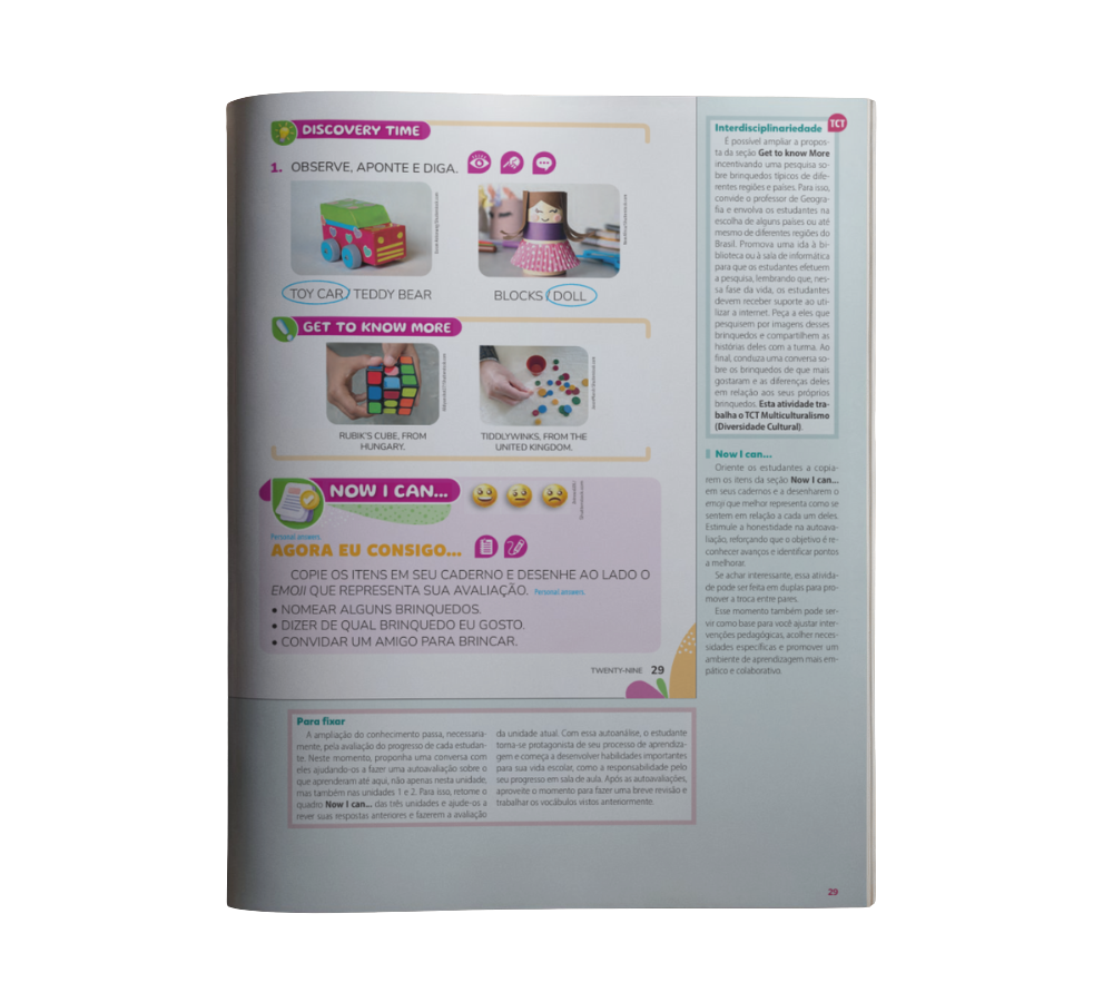 • Segurança e praticidade para o professor: a coleção é pronta para uso, com organização didática clara, linguagem objetiva e grande variedade de atividades, reduzindo a sobrecarga docente e facilitando o planejamento das aulas de Língua Inglesa nos Anos Iniciais.