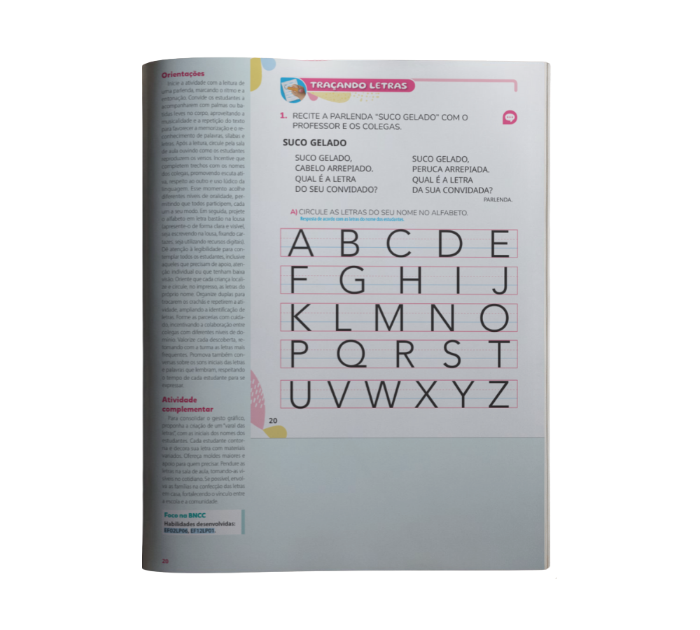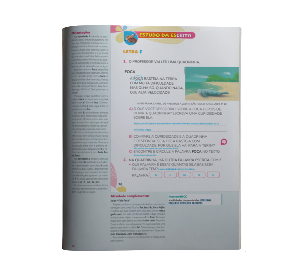 Com propostas lúdicas e progressivas, trabalha de forma integrada leitura, escrita, oralidade e análise linguística, valorizando a diversidade de gêneros textuais, a literatura e a consciência fonológica. As unidades, mais curtas, permitem maior foco pedagógico e contam com revisão sistemática frequente, garantindo acompanhamento contínuo da aprendizagem. A progressão da letra de imprensa para a cursiva ocorre de forma gradual, sempre com apoio consistente ao professor por meio do Manual do Professor.