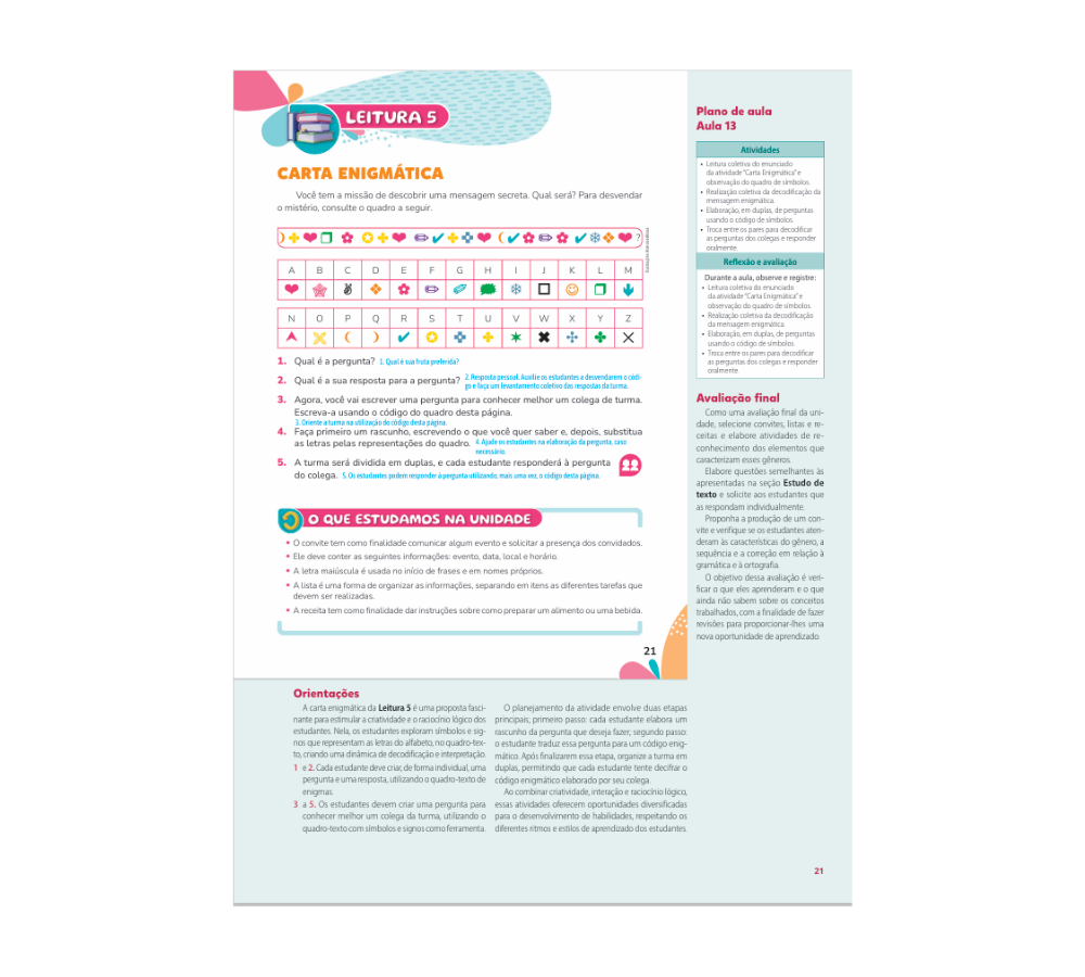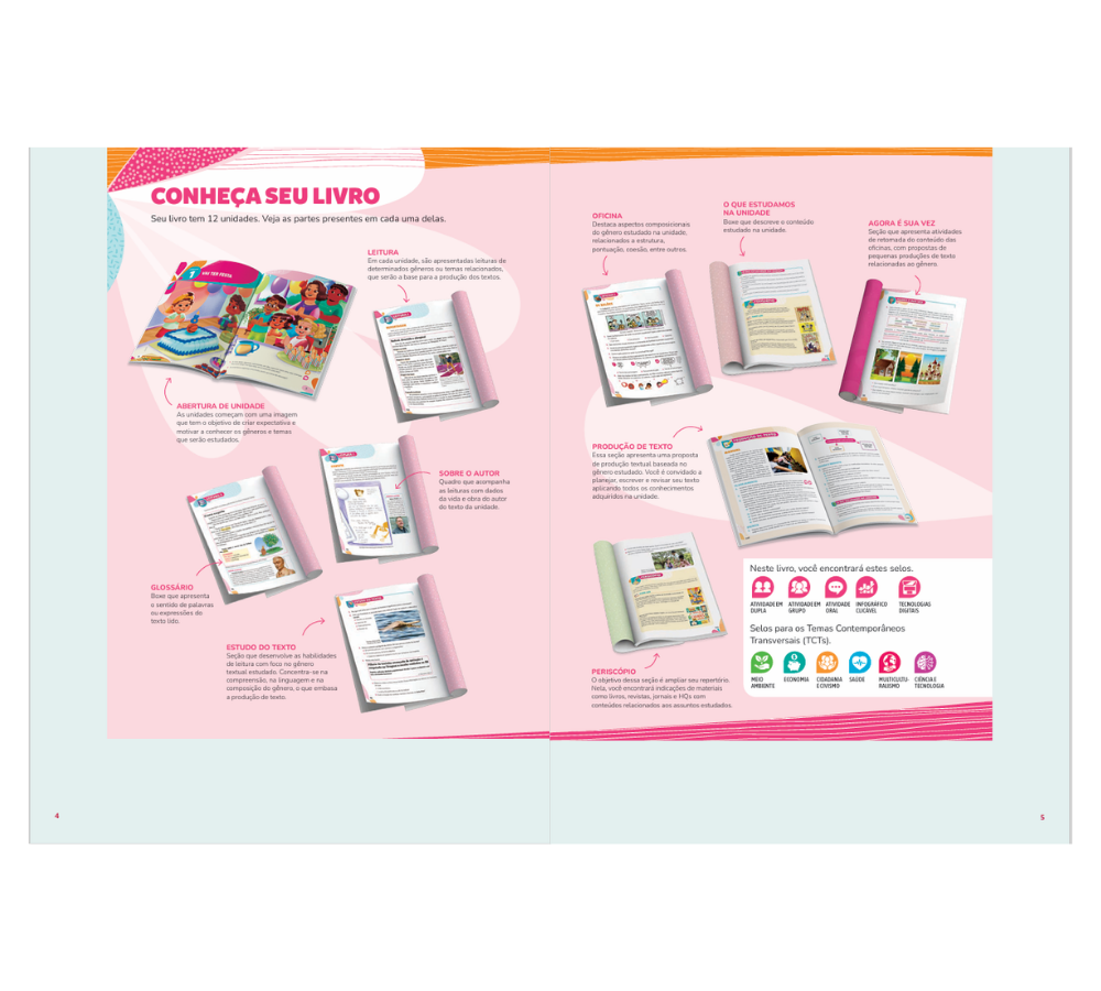 • Escrita conectada à leitura e à realidade. Textos curtos, temas atuais e diversidade de gêneros ampliam o repertório e tornam a prática da escrita mais significativa e contextualizada.